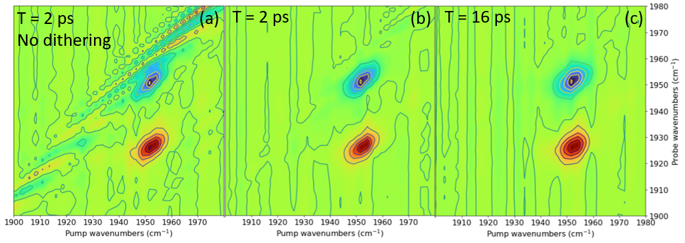 The graph below shows the 2DIR spectra obtained in carboxy-hemoglobin after Fourier transform with respect to the time delay between the two pump pulses. The raw data (a) shows detrimental oscillations resulting from coherent pump scattering. However, this effect can be mitigated by dithering the pump-probe delay using the piezoelectric actuator (pzt) shown in the above figure. The 2DIR spectrum thus obtained (b) evidences the expected elongation along the diagonal, tending to a more circular shaped (c) when increasing the waiting time [6].