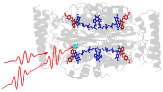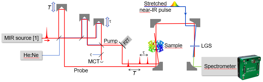 Due to its sensitivity to ultrafast fluctuations and to couplings between vibrational modes, two-dimensional infrared (2DIR) spectroscopy has provided over the last twenty years a wealth of information on chemical and biochemical reactions. In parallel, recent progress in biotechnology now allow the insertion of unnatural amino acids at specific sites of proteins. As some of these unnatural amino acids can serve as local vibrational probes, their association with 2DIR spectroscopy can bring combined spatial and temporal resolution to the investigation of protein conformational dynamics. However, the development of this emerging approach has been hindered by signal-to-noise and data throughput limitations associated with current 2DIR spectrometers, most often based on 1-10 kHz Titanium:Sapphire femtosecond amplifiers. The aim of the MIRThyX project is to address this technical barrier by developing a new-generation 2DIR spectrometer that will take advantage of the recent advent of diode-pumped ultrashort lasers, and to apply this new instrument to the investigation of the structural dynamics of the flavoenzyme ThyX. The project is carried out by three partners: two academic partners, Laboratoire d’Optique et Biosciences (LOB) and Laboratoire Charles Fabry (LCF) and one industrial partner, Amplitude. The remarkable complementarity of the partners thus covers the broad range of skills needed for undertaking this interdisciplinary project, involving laser technology, mid-infrared (MIR) pulse generation and characterization, 2DIR spectroscopy and biochemistry.