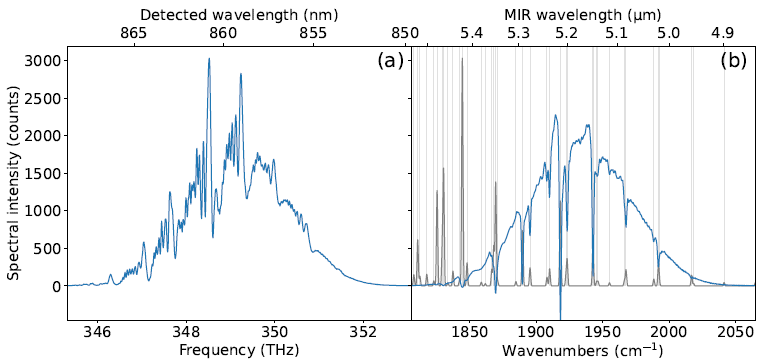 We have extended the Chirped-Pulse Up-conversion (CPU) method, previously demonstrated with Ti:Sa femtosecond amplifiers at 1 kHz, to these new high-repetition rate MIR sources [5]. Thanks to the use of a fast CMOS linear camera, the up-converted spectra could be measured individually at the repetition rate of the laser, here 100 kHz. The figure below shows the spectrum corresponding to a single pulse (a). After suitable Fourier processing the effects of cross-phase modulation can be removed, yielding a corrected spectrum (b) with a spectral resolution of 1 cm-1, as evidenced by the narrow absorption lines resulting from water-vapor absorption.