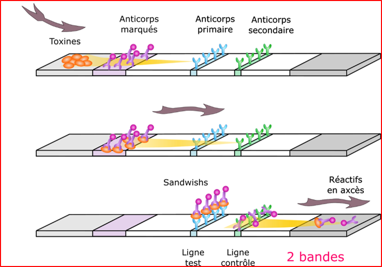 The sensitive in vitro detection of biomolecules is essential in numerous contexts, notably for medical applications, either for efficient pathogen identification or biomarker monitoring. The possibility to achieve high sensitivity with simple devices is thus an important objective to enhance the characterization of environmental samples or the diagnosis efficiency and consequently the prophylaxis or the patient care. For this purpose, we are developing the use of lanthanide-based photoluminescent nanoparticles as ultra-sensitive biological in vitro reporters. These nano-objects, synthesized in the Condensed Matter Physics Lab (Ecole Polytechnique) have remarkable optical properties, including exceptionally high brightness and photostability. We notably design the protocols and the instrumentation for fast multiplexed nitrocellulose-based assay (or Lateral Flow Assays ). Based on this approach, we realize the quantitative detection of multiple pathogens at ultra-high sensitivities (picomolar) for fast tests (Figure).