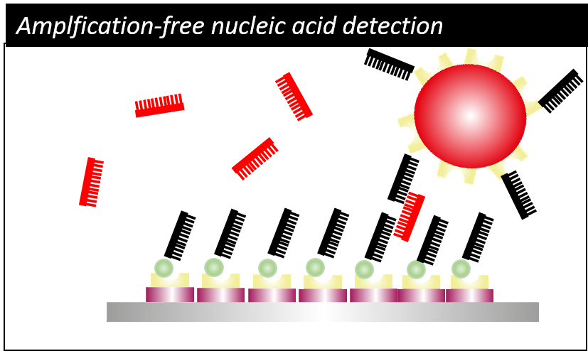 We are furthermore developing innovative technologies for the ultra-sensitive detection (i.e. in the femto- and attomolar range) of protein and nucleic acids (DNA and RNA) in biological samples, as an alternative to the current usual and/or most sensitive tests (ELISA, ECLIA, Simoa, (q)PCR ,...), by respectively using immunolabeling or hybridization strategies . Based on custom-made instrumentation, we are performing the detection of multiple targets in various environments (aqueous buffers, plasma, cell culture,...), which are the basis of future diagnostic tests.