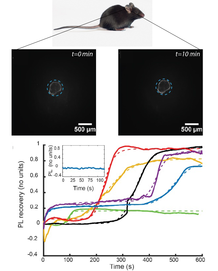 Based on the nanoparticle luminescence properties, we are furthermore developing methodologies for ROS probing at larger scales, either on-chip or in vivo (FIgure 3) in pathological models. The objective of this work is thus the monitoring of pathological, e.g. inflammation-related, transitions at the molecular scale, in complex, physiologically relevant, systems.